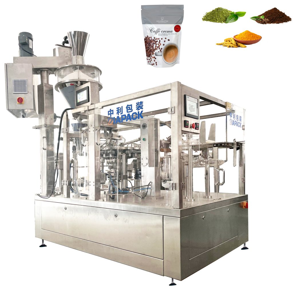 Rotary poka-gefið pakki vél með mismunandi skömmtum (ss multihead weigher, auger filler, fljótandi fylliefni osfrv.), Hentar fyrir sjálfvirka pökkun fyrir korn, duft, vökva, líma osfrv. mismunandi gerðir af rpoduct með premade standa upp pokanum, íbúð poka og svo framvegis.