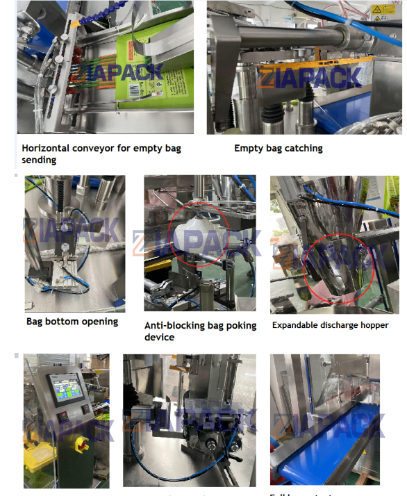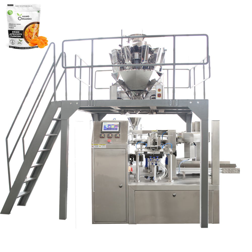 Rotary poka-gefið pakki vél með mismunandi skömmtum (td multihead weigher, auger filler, fljótandi filler o.fl.) getur hentað fyrir sjálfvirka pökkun fyrir korn, duft, vökva, líma o.fl. Mismunandi tegundir af vöru með premade standa upp rennilás poka og svo framvegis.