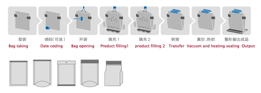 Verkflæði: poki→ framleiðsludagur prentunar→ opnunarpoki→ fylling 1→ fylling 2→ laust → hitaþétting→ mótun og framleiðsla