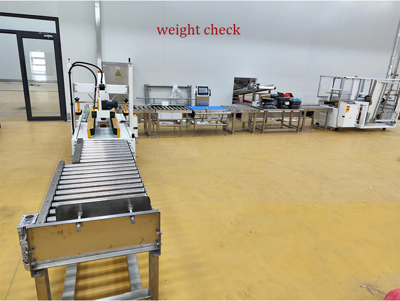 Eftir að pokarnir hafa verið fylltir af frosnum matvælum er hver poki endurskoðaður með þyngdarskynjara til að tryggja að þyngdin passi við markþyngdina og fer síðan í gegnum málmskynjara til að tryggja að engum málmi sé blandað í hvern poka. Pokarnir eru síðan fluttir í öskjufyllingarlínuna.