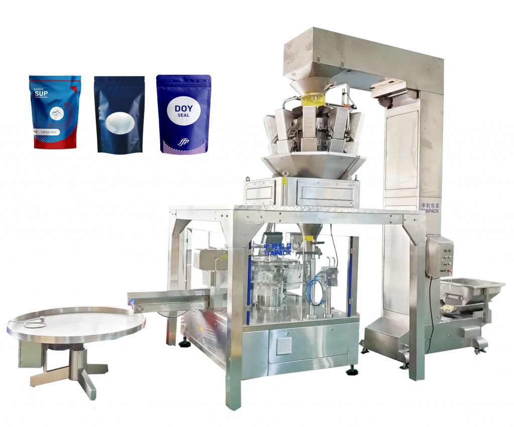 Fyrirframbúin poki fylla og innsigli vél, sem samanstendur af 8 vinnustöðvum með skilvirkni og stöðugleika, leggur áherslu á pakka af standa upp poka, rennilás poki, púði poki og ýmis pre-gert pokar. Samstarf við mismunandi skömmtunarkerfi (samsetning vega / línuleg vega / auger skrúfa / stimpla filler) og sjálfvirk lyfta færibönd, það er víða beitt á korn, vökva og duft.